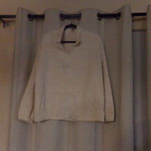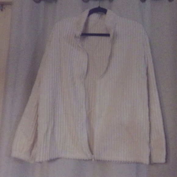 Cream-colored jacket, zipper up the front. Size medium, Measurements pit to pit 21 inches laying flat (42 inches around), sleeve 21 inches, shoulder to waist 25 inches.