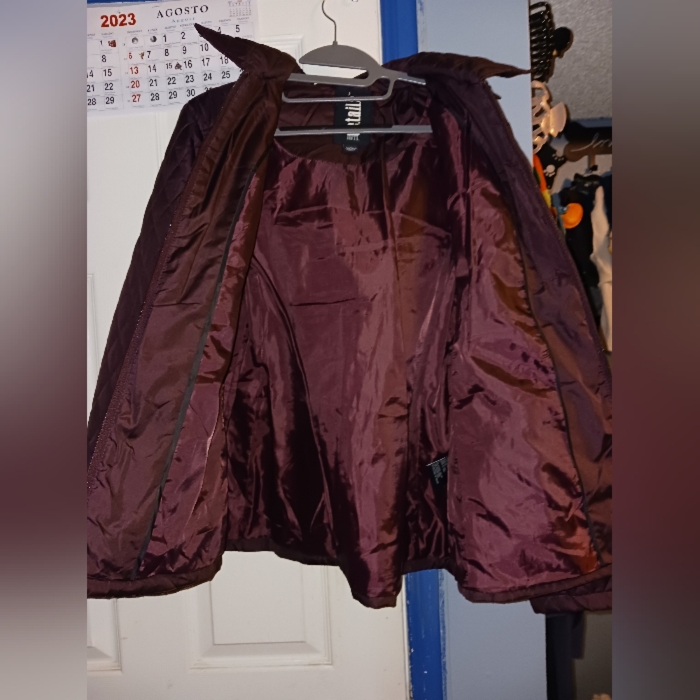 purple jacket with two povkets also has a hood with soft material inside perfect for winter