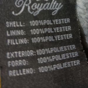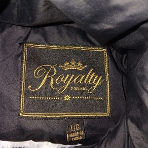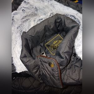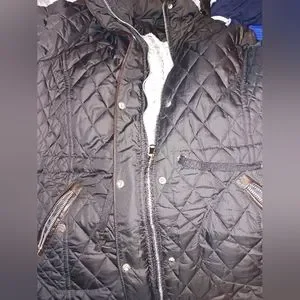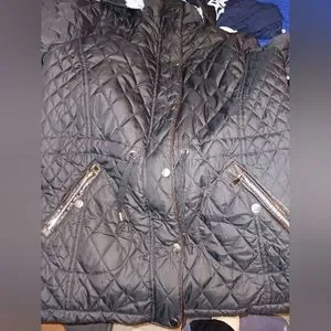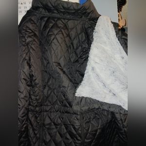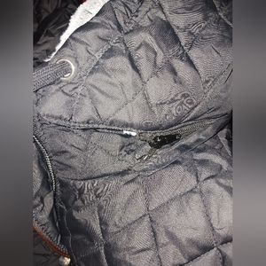 Black jacket with a zipper and buttons has pockets with fuzzy inside very varm for the cold weather