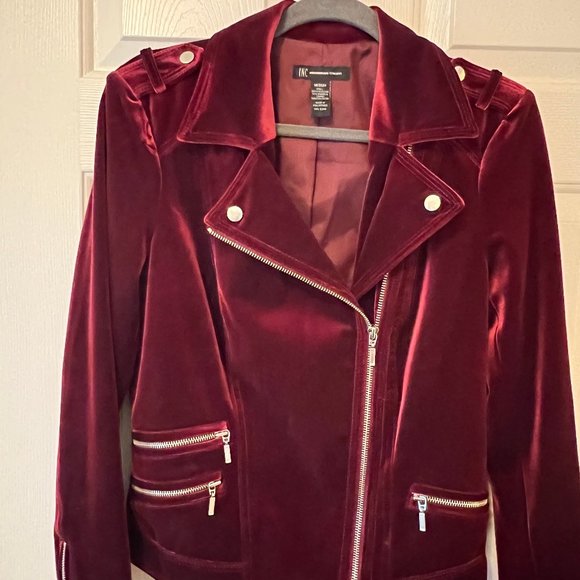inc. wine velvet motorcycle jacket with zipper cuffs. Size medium. Great condition