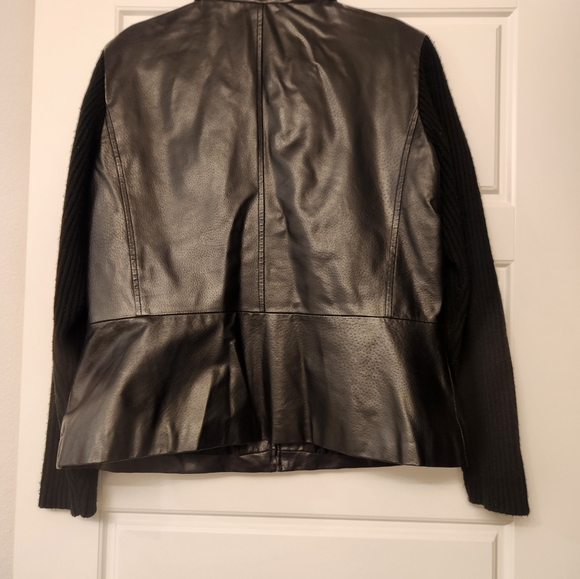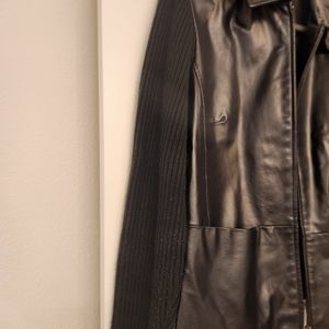 Leather with sweater sleeves.The bottom flares out a little