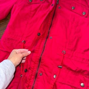 YMI brand red winter jacket. Hood is detachable, zips and buttons. Inside is a warm material. Size medium.