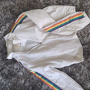 white jacket with rainbow colors on sleeve. Jacket is in good conditon. Very cute. windbreaker.