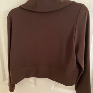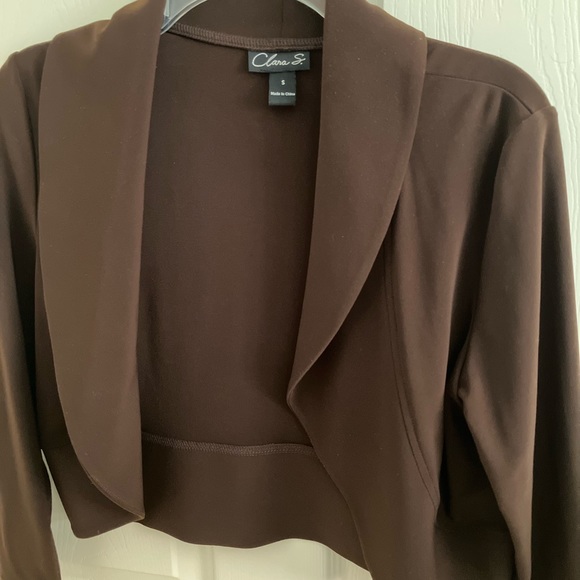 Cute, brown short bolero jacket. 70% polyester, 20% rayon, 10% spandex. Hand wash cold water. Cute for a night out on the town. Can be dressed up or down.