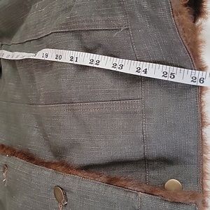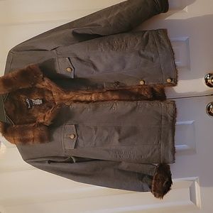 Green(ish)denim, side pockets, top buttoned pockets, faux fur lining, cuffed...heavy