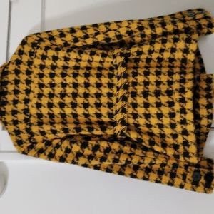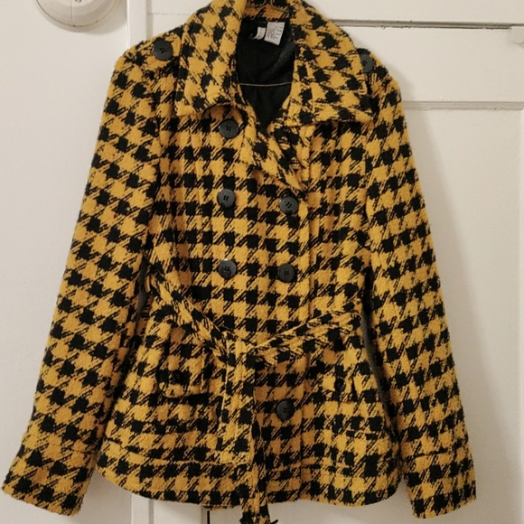 This waist-length jacket is more like coat material. The shell 35% wool and 65% polyester. The lining is 100% polyurethane backing. It's double-breasted with buttons on the back of each sleeve, on the front pockets and on the shoulder lapels. It ties at the waist with a matching belt. The perfect item to wear with black pants.