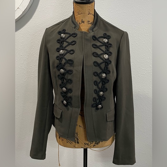 This flattering jacket has a nod to an old style military jacket. Olive in color.