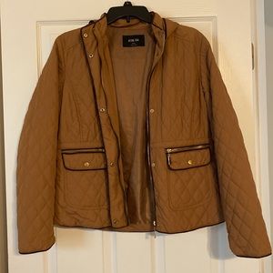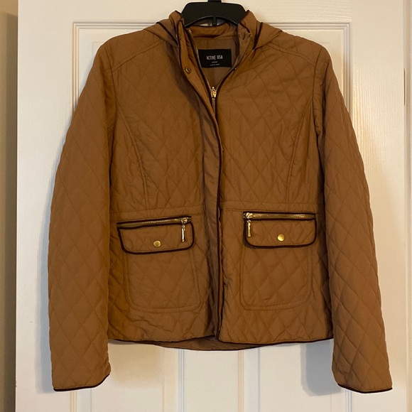 Tan/brown trim hooded jacket in EUC. Zippered with snaps. Only worn once. Quilted polyester shell with lining. No flaws.