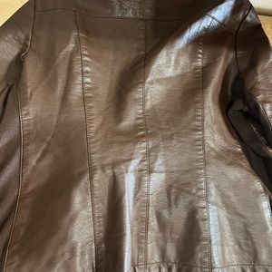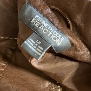 Very good used condition Kenneth Cole Reaction faux leather brown jacket. Soft and supple feels nice quality. Says large, fits forgiving and flexible with the stretchy sides, medium/large. Non-smoking and poodle friendly home.