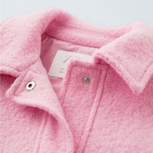 Long sleeved overshirt with lapel collar. Front button closure hidden by a flap. Hidden side pockets. 100% wool.