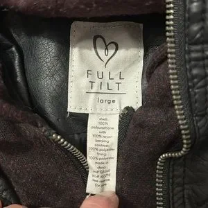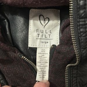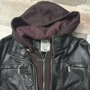 Faux leather jacket with sweatshirt hood Excellent condition, only wore couple times Juniors size Large fits womens small