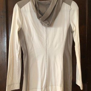 Beige & Ecru fitted, zip front, long sleeved, hooded shirt with small pockets.