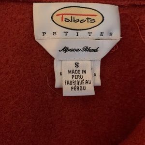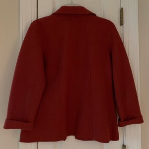 Beautiful burnt orange jacket in excellent condition. Button closure with side pockets that zip. Material is on the thinner side and not bulky at all. Even though it’s a small it seems to run on the larger side