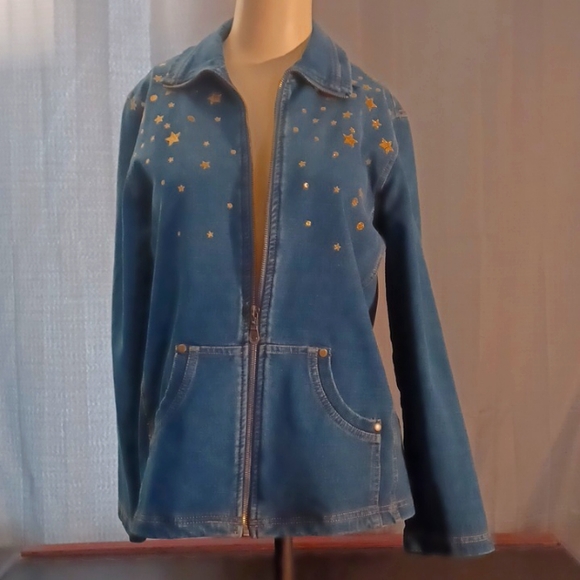 denim colored zip up jacket. Soft sweatshirt fabric with gold stars and moon