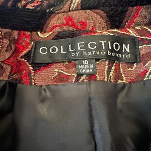 This is a blazer or jacket that is beautiful jacquard woven material. This jacket is not lightweight as has a little thickness and to me it’s kinda dressy. The front is plain with no buttons and Bell sleeves. Black background with nice design with brown, red, beige and gold. Has a 100% black polyester lining. It’s in excellent condition.