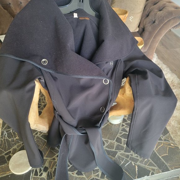 Black rain jacket, great for spring and fall. Unique and love the snaps