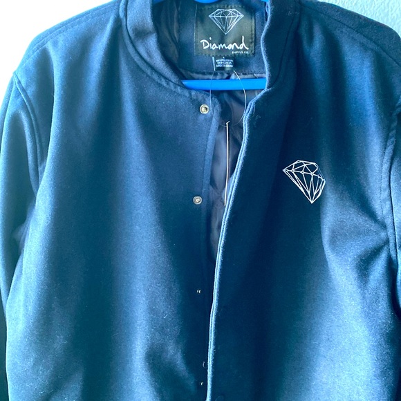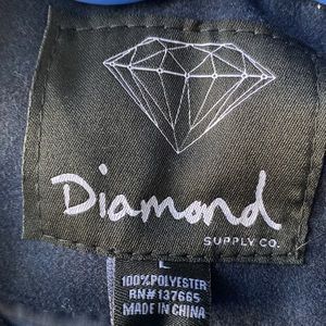 Navy blue with 3 pockets. 2 in front 1 inside. 100% polyester.