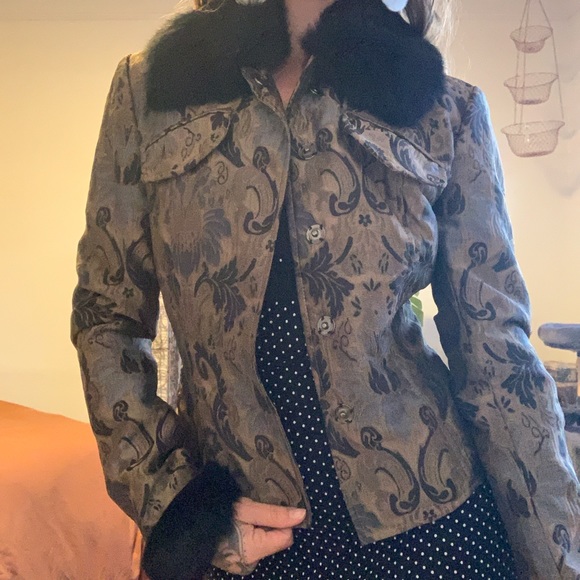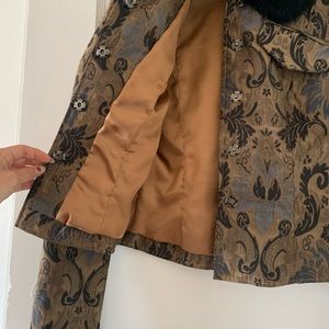 vintage floral coat in brown, with black & dusty blue floral design and fur trim.
