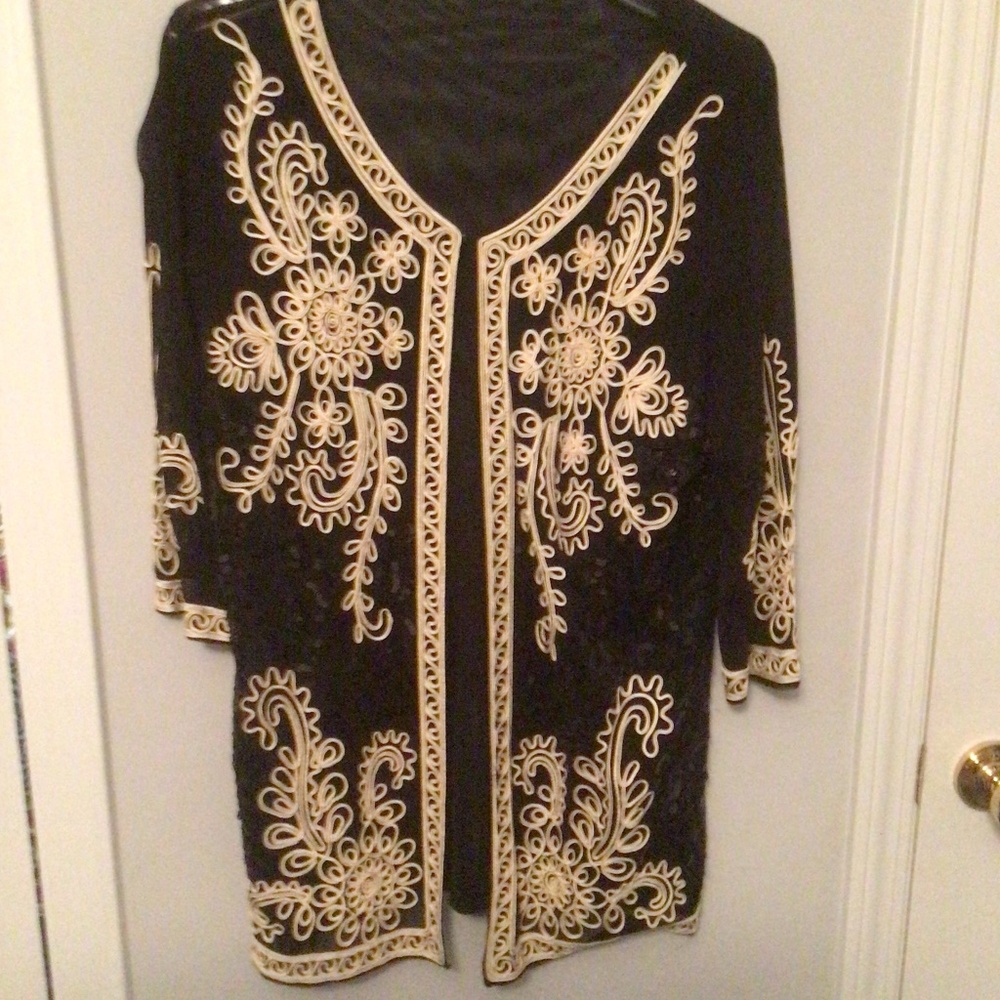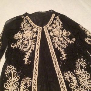 Black sheer jacket with tan embroidery. Made in Mexico. Dresses up any outfit.