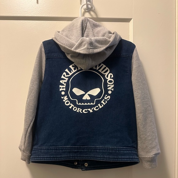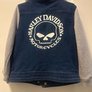 Denim jacket with gray hoodie. Not Harley Davidson brand, it was added on there. The jacket itself has style and is warm for your baby biker child to enjoy