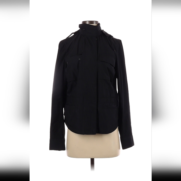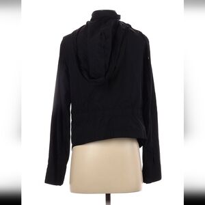 Calvin klein hoodie jacket in color black. Has two chest pockets, two front pockets. Lightweight. 100% Polyester. Measures approximately 40 inches across; front length approx. 22 inches; back length approx. 21 inches; sleeve length approx. 24 inches. In great condition. This is a good staple jacket for everyday wear.