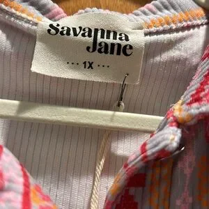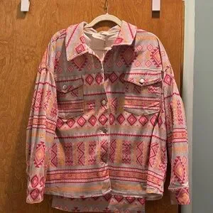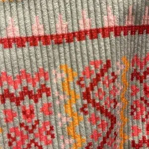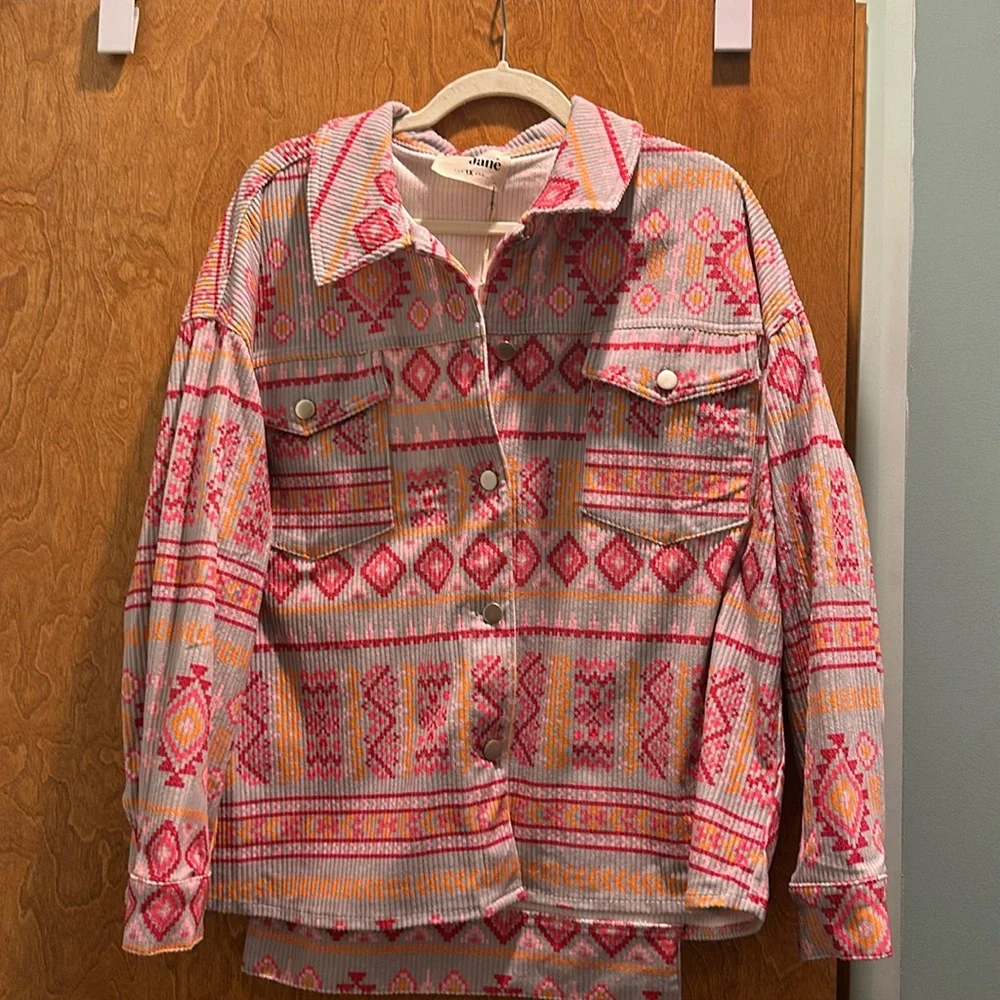 Gorgeous corduroy jacket from savanna Jane in gray with pinks and orange accents. Silver buttons, side pockets , measurements are 25” shoulder to bottom in the front and 25” pit to pit. Did I mention that it also has stretch? Well it does! Pet friendly home, may or may not have a few 🐶 hairs, free of charge😊