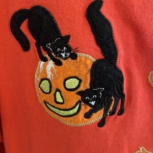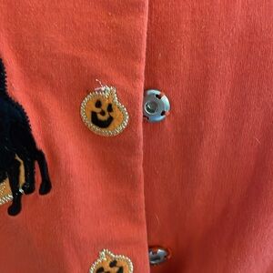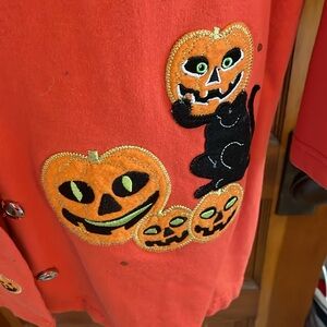 Halloween jacket embellished with pumpkins and black cats and a few rhinestones snap front good condition