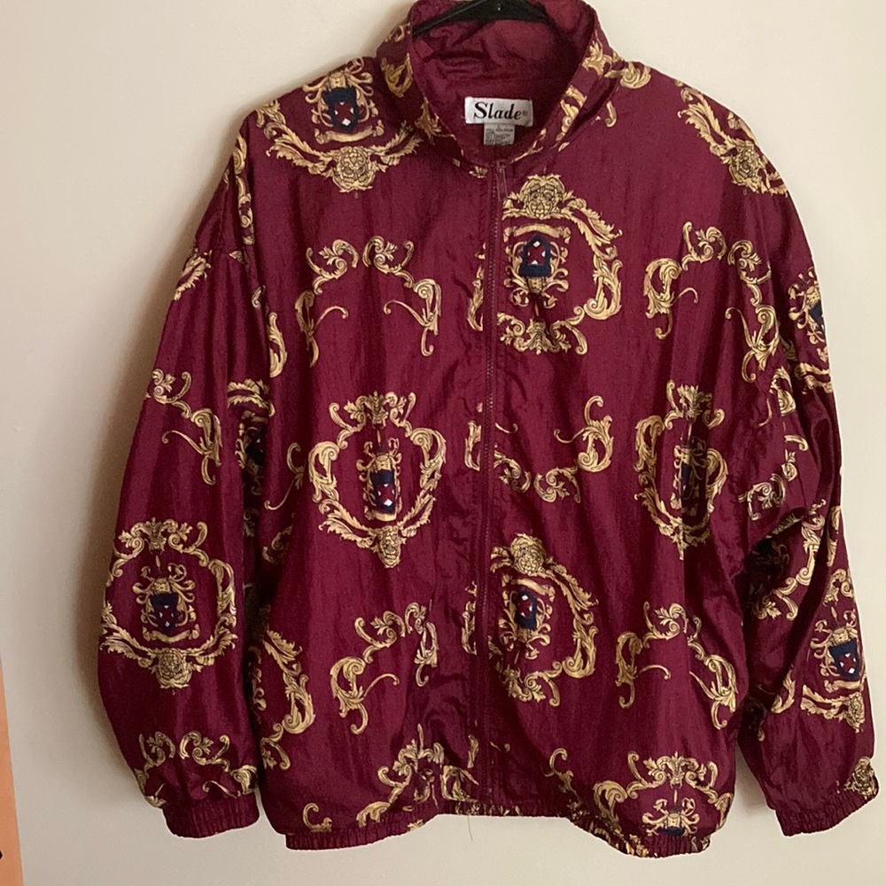 Glorious print on a majestic wine colored background. A nylon shell with a blended cotton polyester lining. Metal zipper ! made in Taiwan and elastic is good!