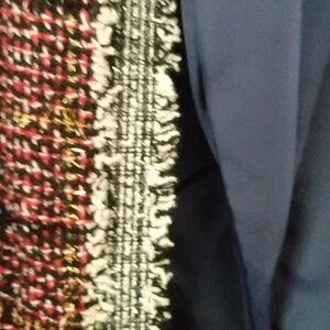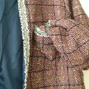 very on trend upscale Tweed style fabric blazer burgundy and navy with fringe some metallic threads 29 inches Plus. fully lined in navy . real pockets. great for dressy occasions and also over jeans. no stretch. by Shein sz 1X.never worn New.
