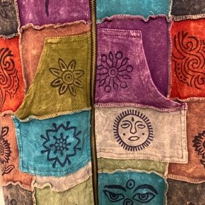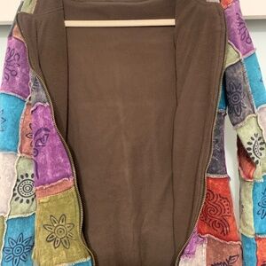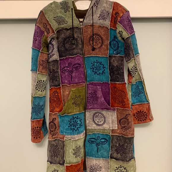 Zipper hooded patch work jacket. Warm. Like new. Bought at Knttos Berry Farm in California. Fits like a small/medium. Smoke and pet free home.