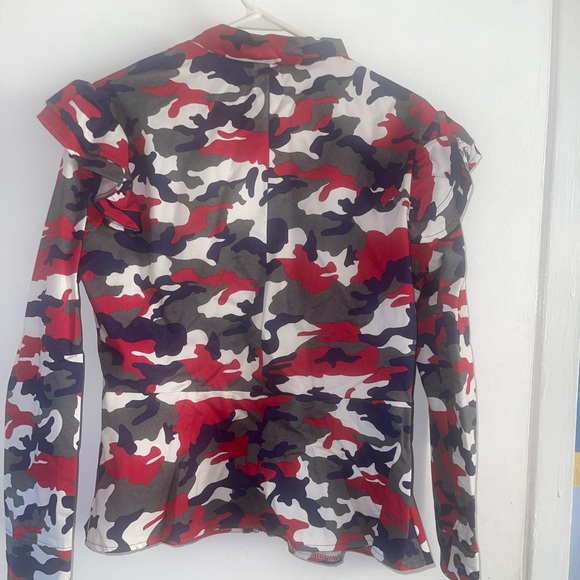 Women’s jacket with ruffled shoulder and flared bottom. red, blue, grey, and white colors never worn