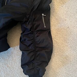 Black jacket with orange liner, ruched sleeves one with zippered pocket, 2 front flap pockets that snap closed. Jacket is medium thickness kind of like a puffer jacket without the puff. 27” shoulder to hem and 23” armpit to armpit.