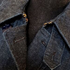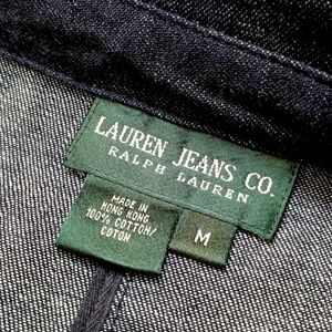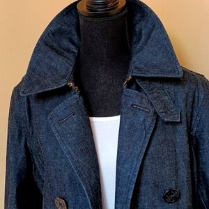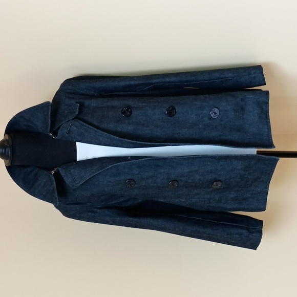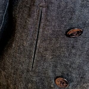 This Beautiful Lauren Jeans Company Denim Jacket is by Ralph Lauren. It is 27" long, with 24" sleeves, and it measures 20" from pit to pit. It's a double breasted style with 8 navy style anchor buttons, with 2 hook & eye fasteners and a button tab at the neck for a more full closure, if desired. It has a detached belt to tie, 2 slit style pockets and a 6" slit in the side seams.