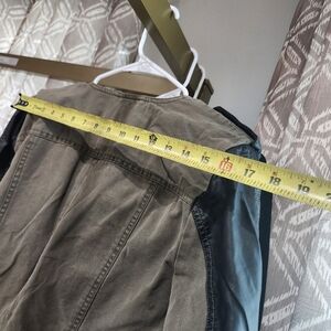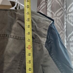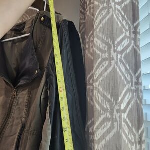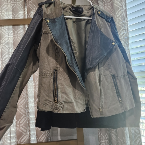 zips up, vegan leather on the sleeves and collars.