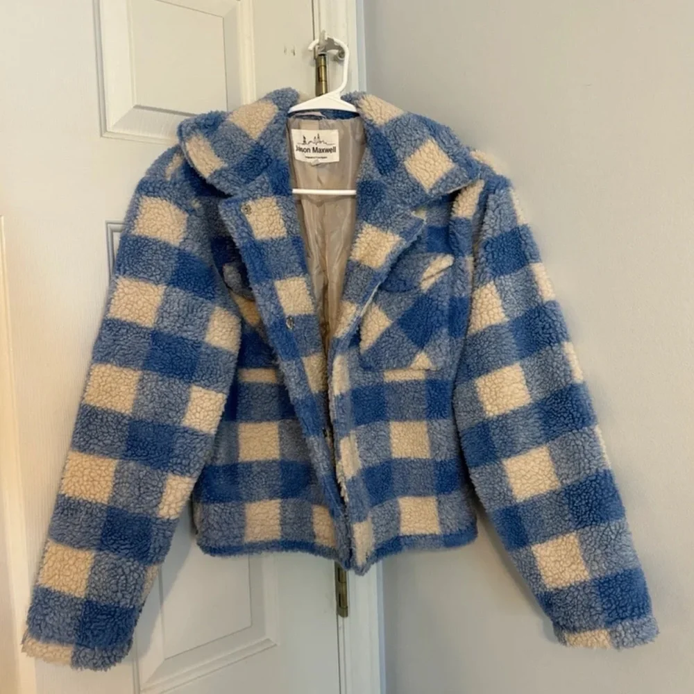 Blue and white wool puffer jacket from ASOS! Never worn out in public, however there is 1 stain on the inside, but barely noticeable. Perfect for UNC gamedays!