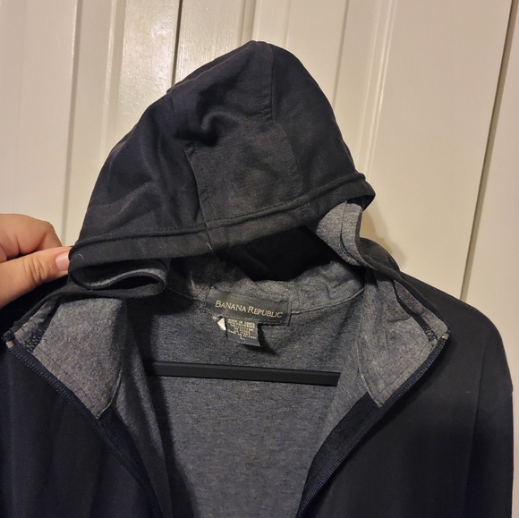Black hooded light weight jacket with gray interior. Zips down and up. Zipper pockets and zipper on the sleeves.