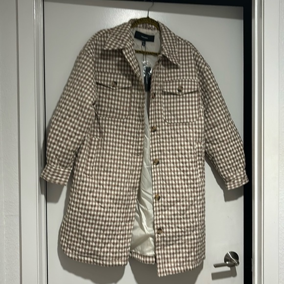 Brown and cream checkered quilted oversized jacket. Button pockets on chest. Never been worn! 33” in length. 6” slit on bottom of each side.