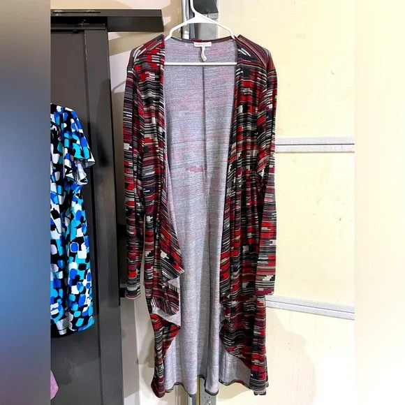 Multi-colored long jacket. Hits below the knee.