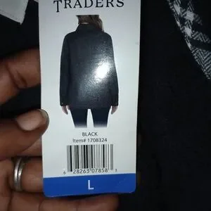 Dark blue jacket,buttoned down, flap pockets. Buttoned down front packet closure. Quilted lined interior w/polyfil. Interior plaid stow away pockets.