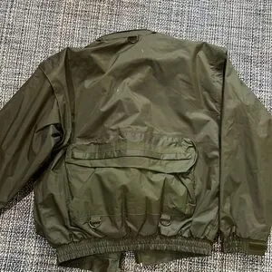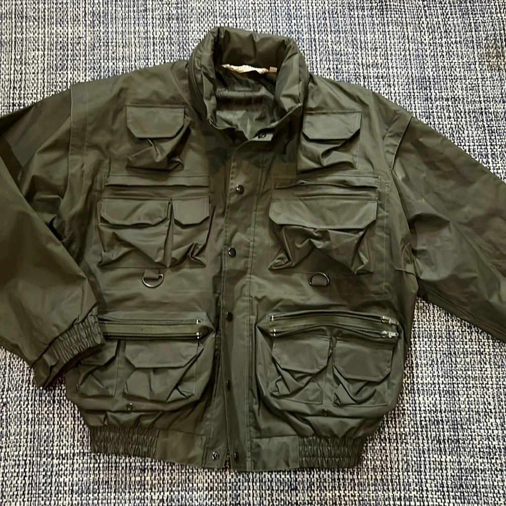 Nylon field jacket that can be used for hunting and fishing. Zip off sleeves. No rips stains tears holes or snags.