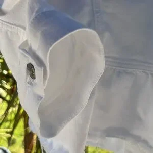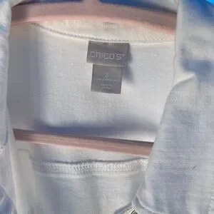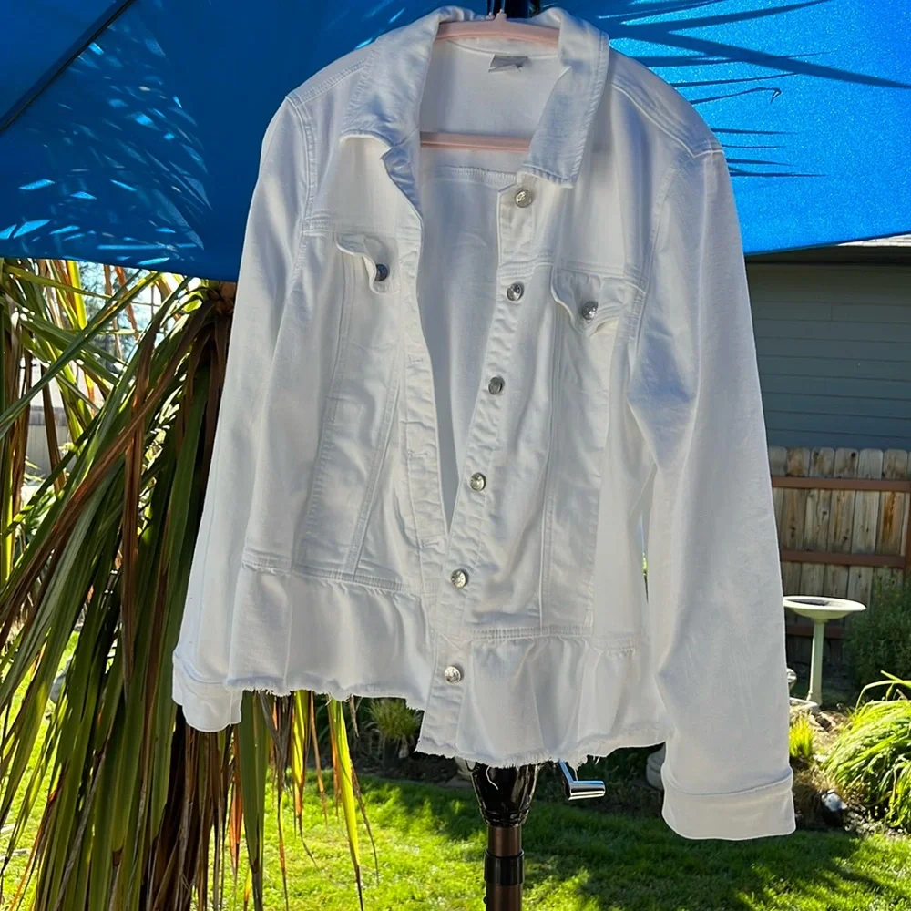 Denim button front ruffle ham stretch, Jean jacket, no stains no tears, good condition. This is not a junior size. It’s a three in Chico brand so it’s a women’s.