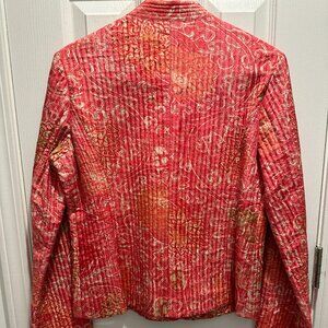 Salmon and tan quilt jacket. One button closure and no collar. Adorable on!