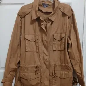 Tan over the hips jacket..has pockets..lots of little details..zips and buttons