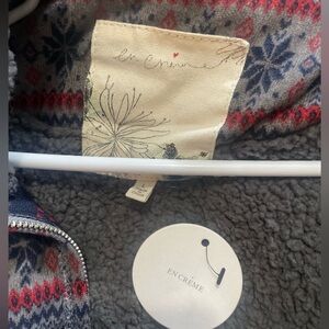 Fun print jacket. Sherpa material on the inside. Functional zipper. Never worn.