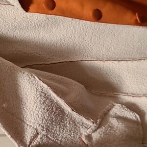Burnt or rust colored orange jacket. Super soft fuzzy interior suede like exterior. Waste length, very warm. size 1=s/m
