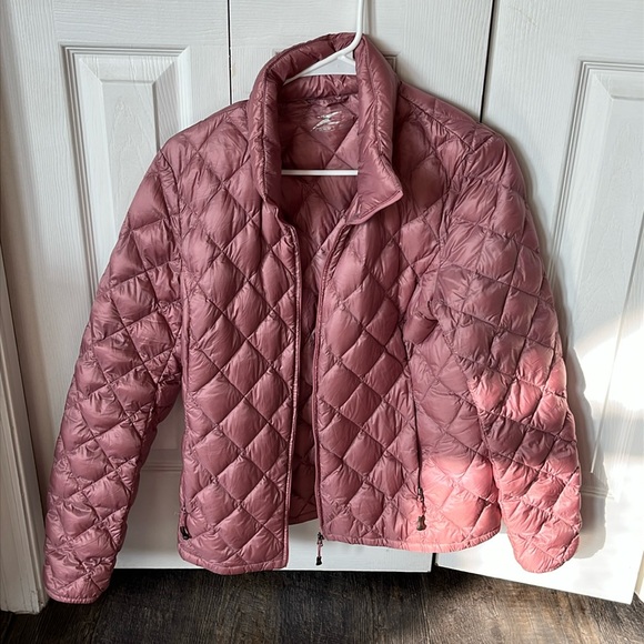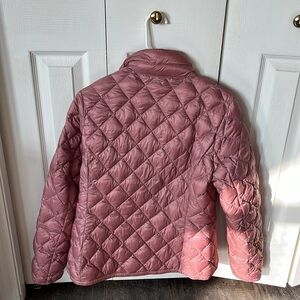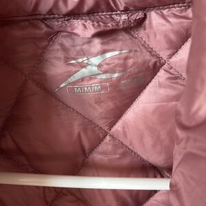 Pink puffy zipper front jacket. 2 outer zipper pockets. 2 inner pockets.