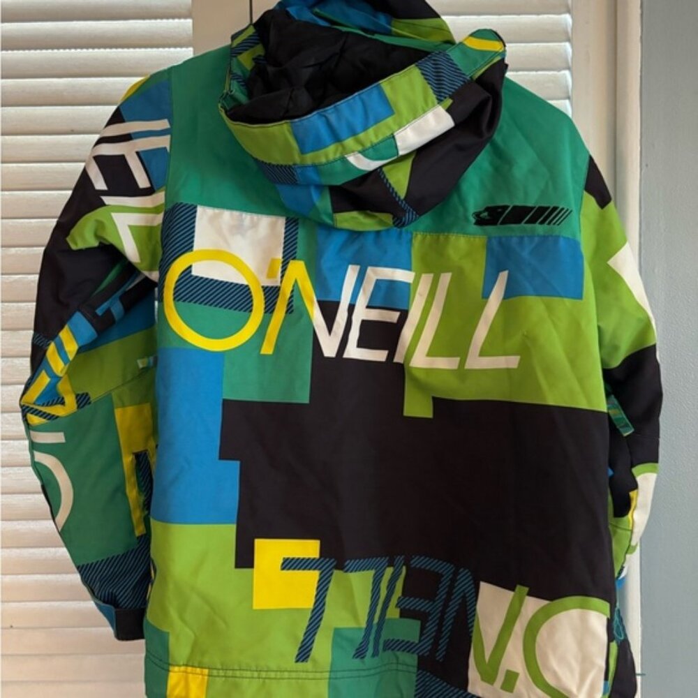 Vibrant kids jacket with bold O'Neill branding. Features a mix of green, blue, and black colors. Perfect for outdoor adventures.