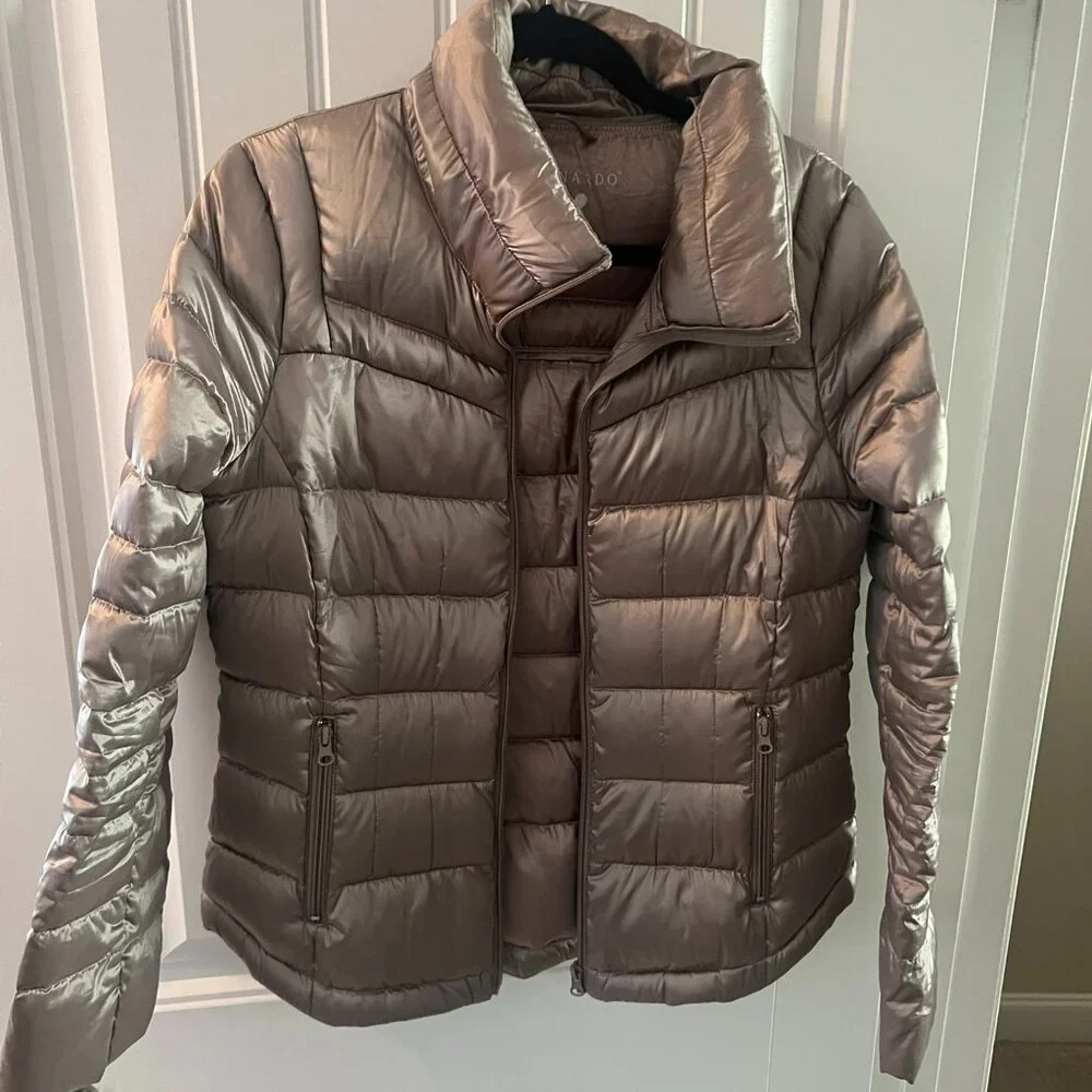 Lightweight puffer jacket in light tan color. Can easily be packed in a suitecase. Has side zip pockets and is a waist length jacket.