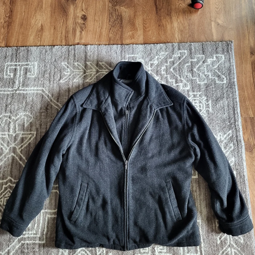 Men's jacket. It has a double zipper, with 2 pockets on the outside and 3 pockets on the inside. Worn a few times but in good condition.