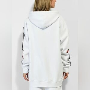 White jacket with red flowers and thorns surrounding the skeletal body on the jacket.